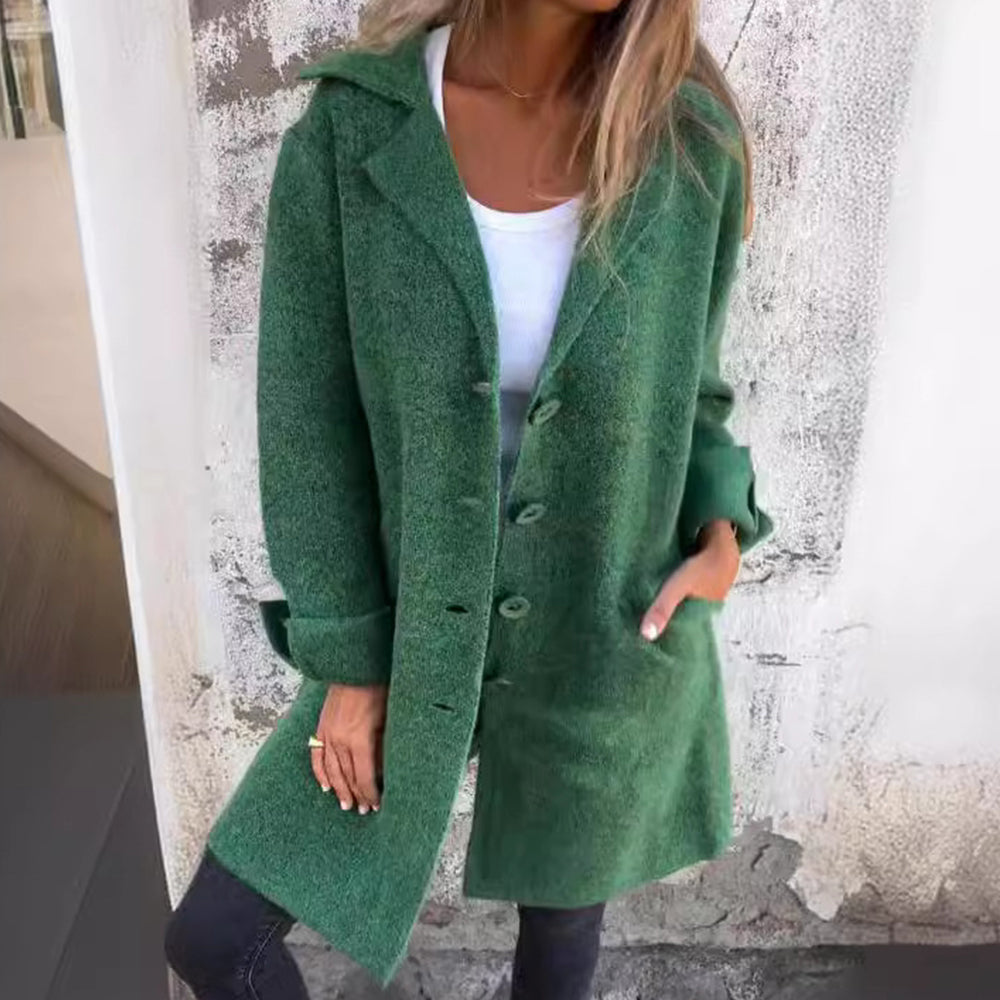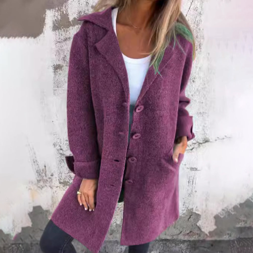 Einreihiger, mittellanger Damenmantel mit einfarbigem Revers und Taschen