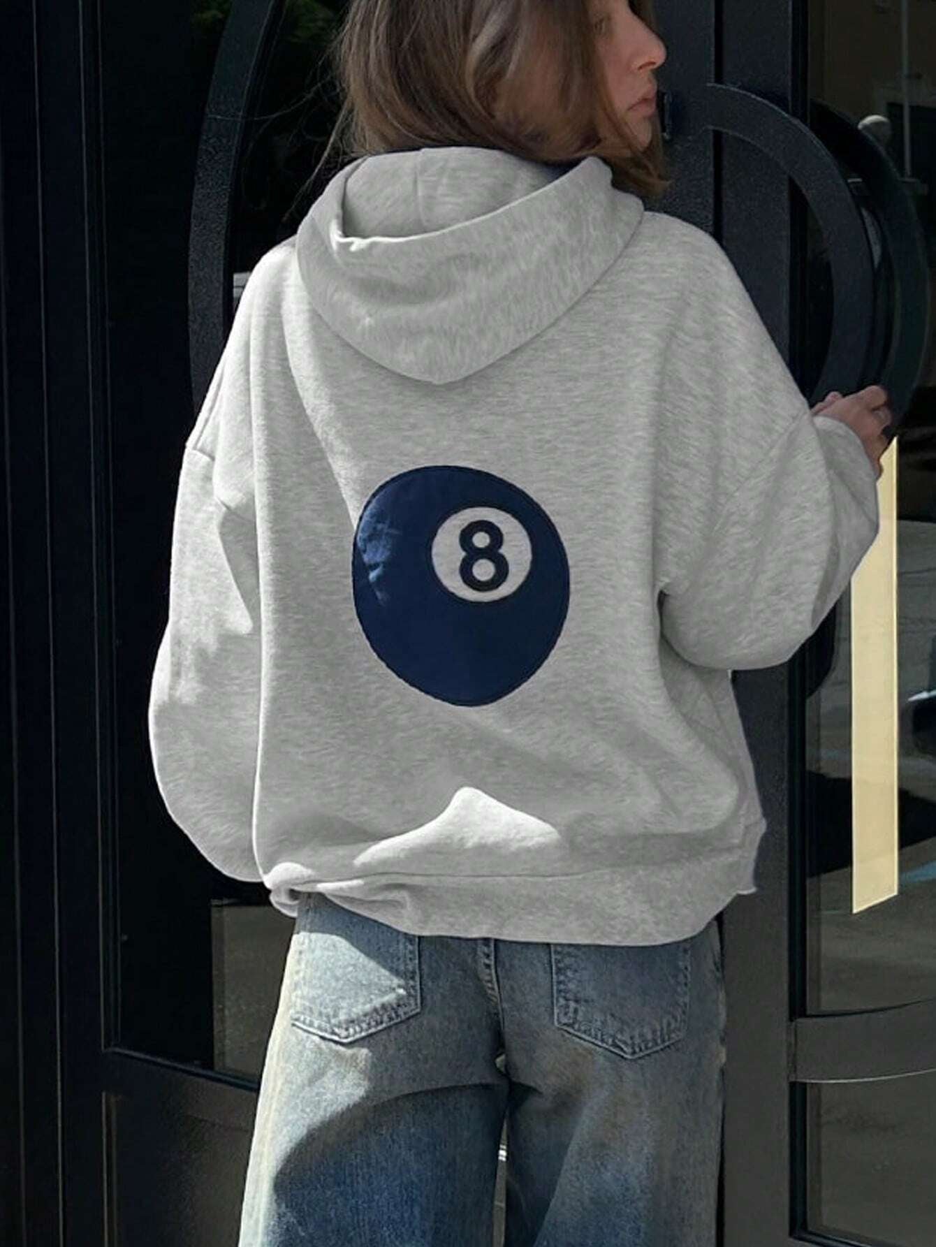 Lässiger Oversize Damen-Hoodie mit Kordelzug, hellgrau, mit 8-Ball-Aufdruck auf der Rückseite