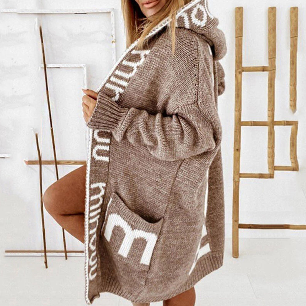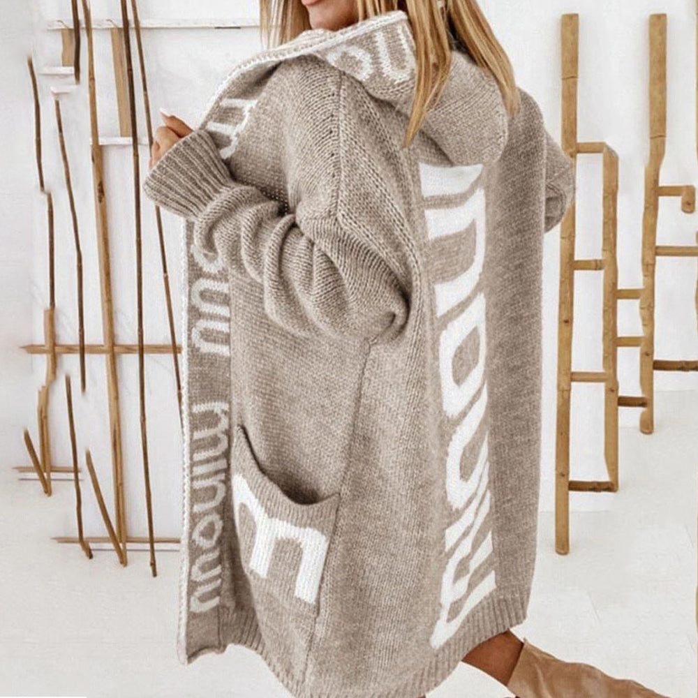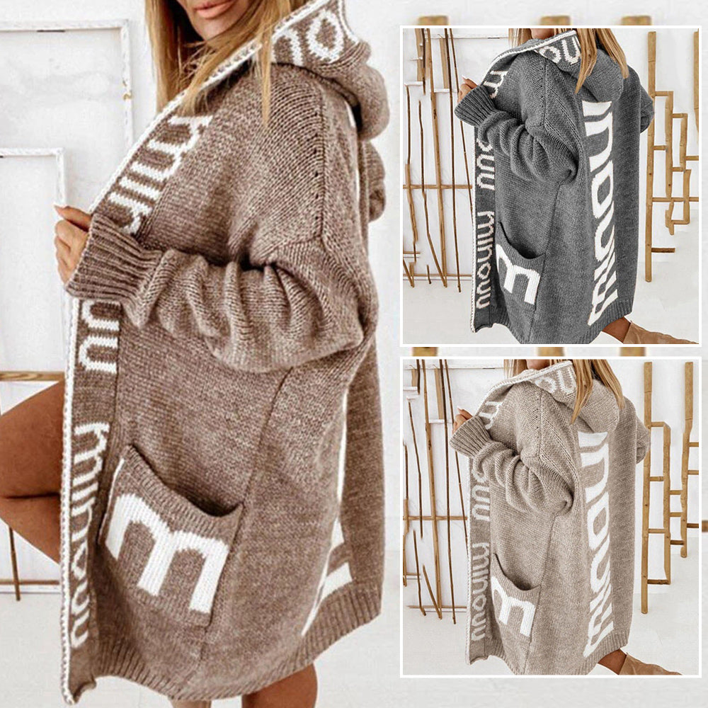Herbst und Winter trendiger Damenpullover mittellanger, lockerer, personalisierter Buchstaben-Kapuzen-Cardigan