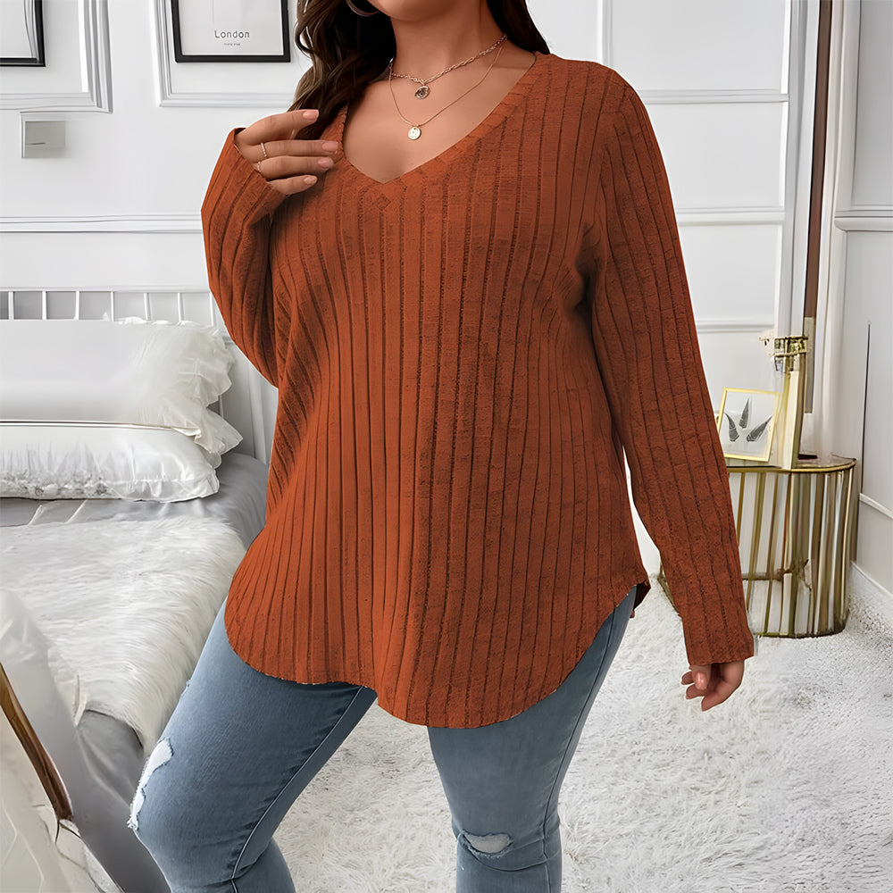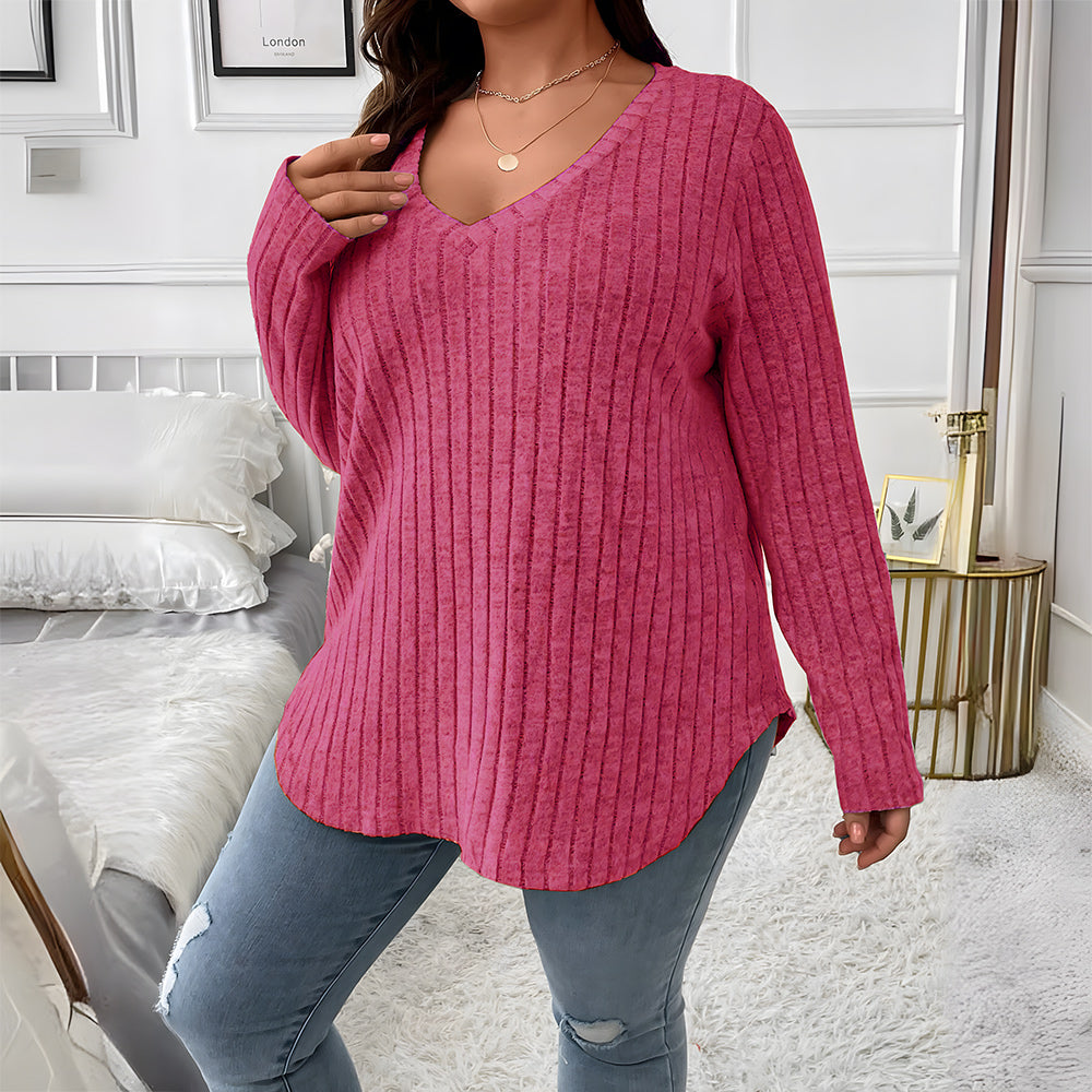 Neues einfarbiges, langärmliges, lockeres Damenoberteil mit V-Ausschnitt