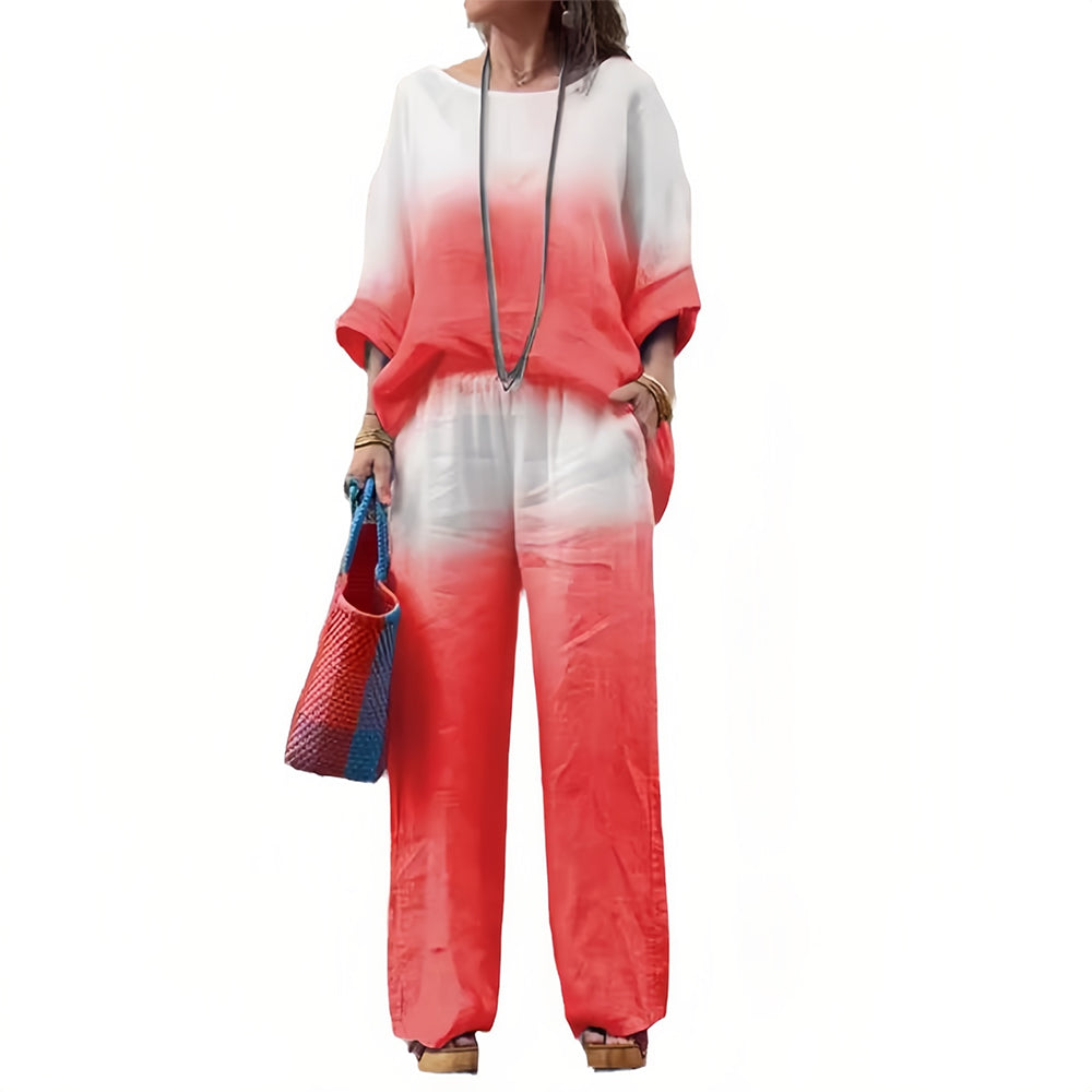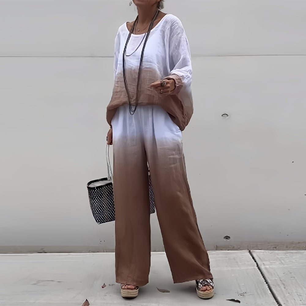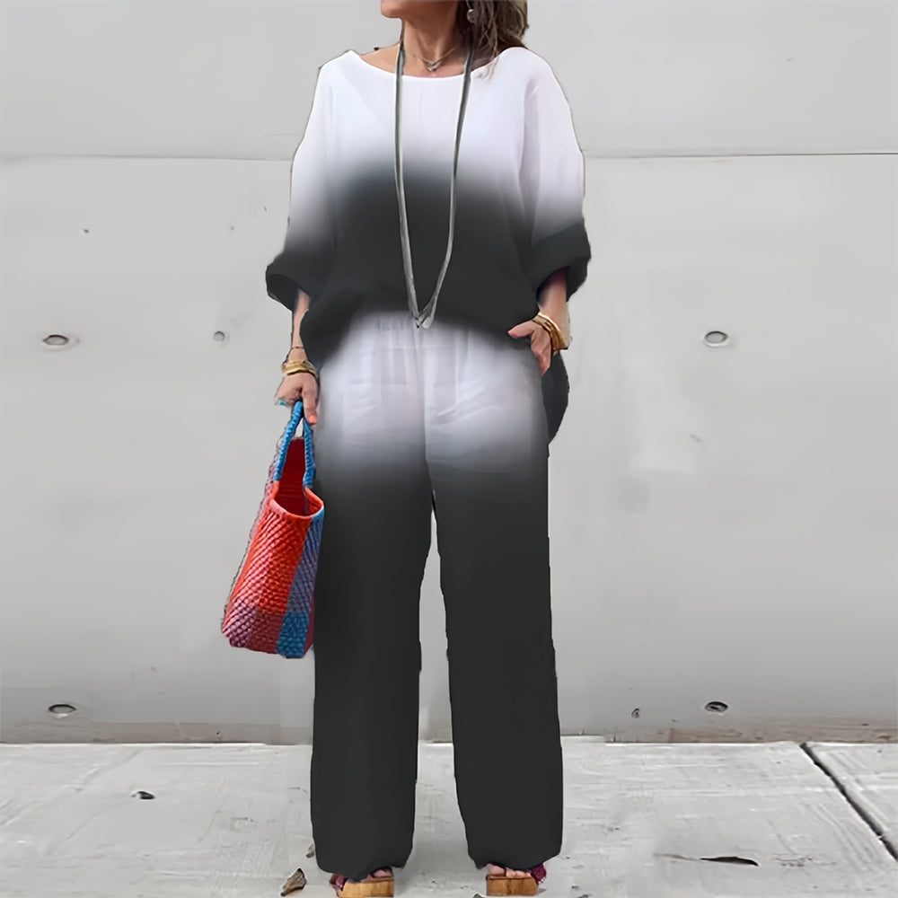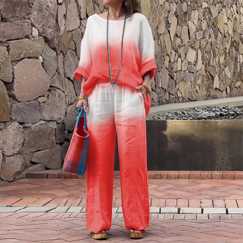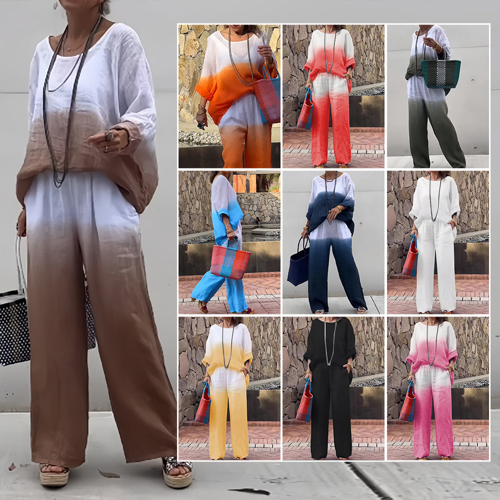 Modisches T-Shirt + Hose aus Baumwolle und Leinen mit Farbverlauf und Rundhalsausschnitt für Damen
