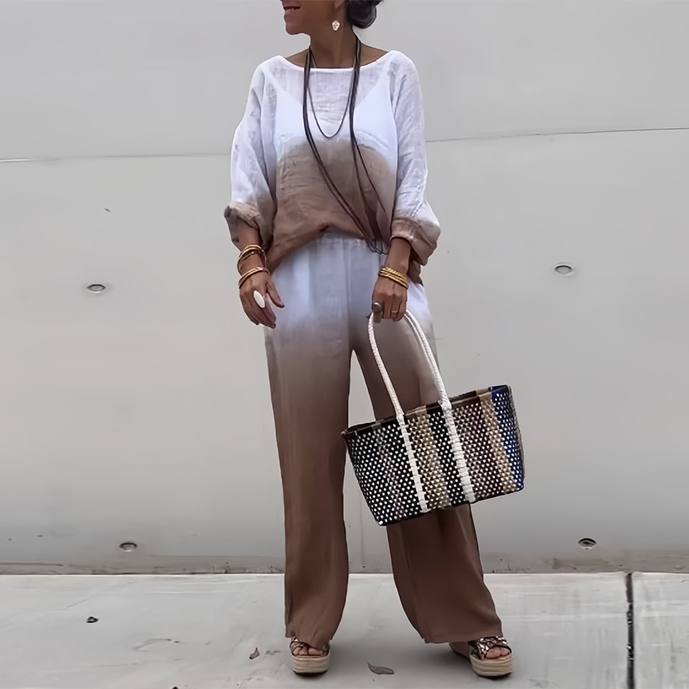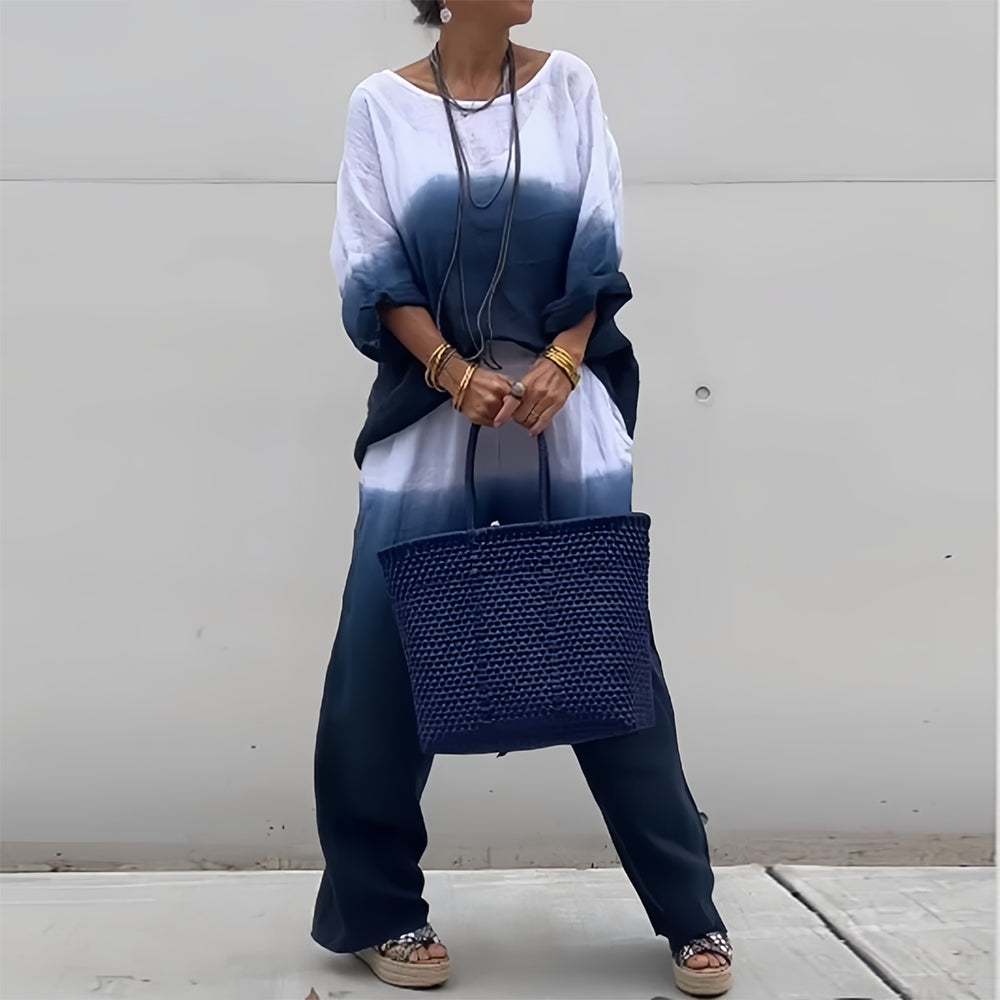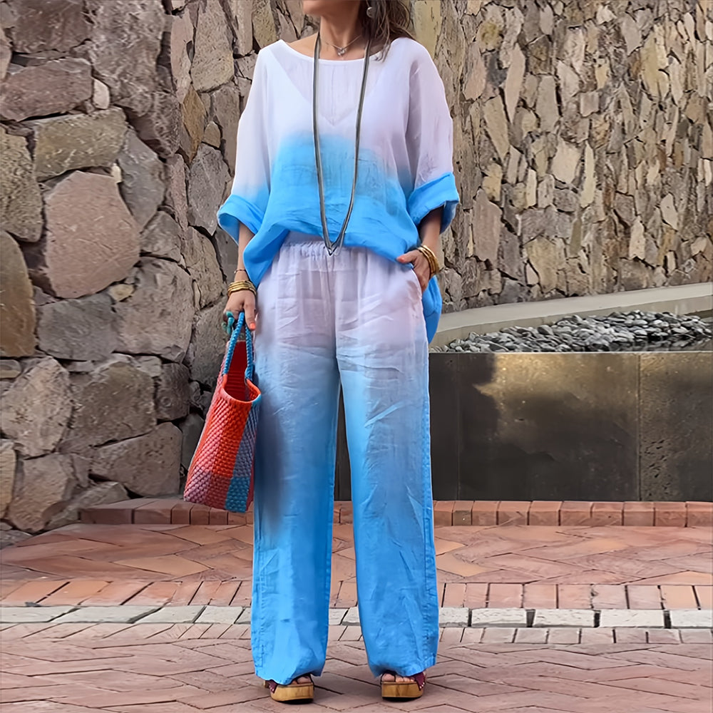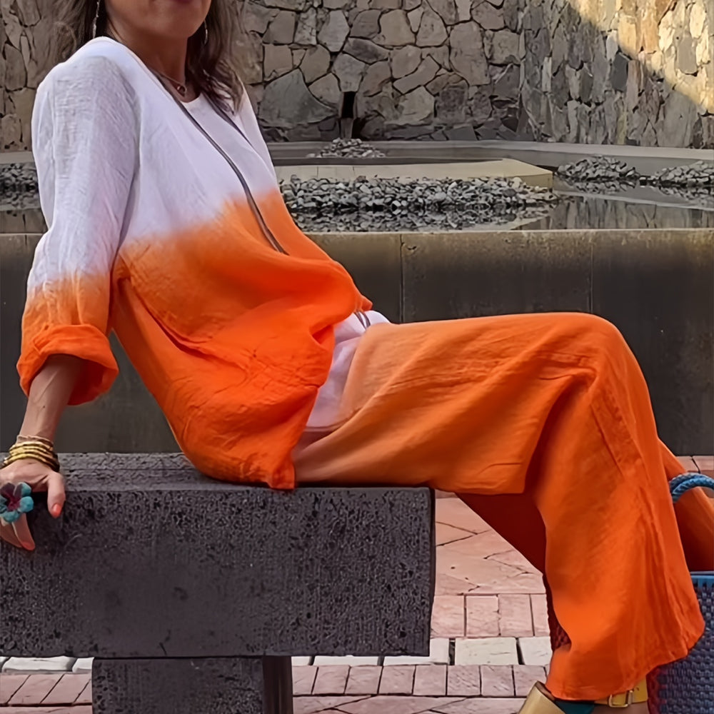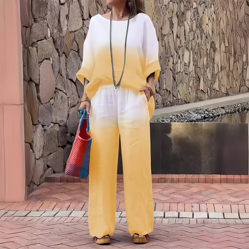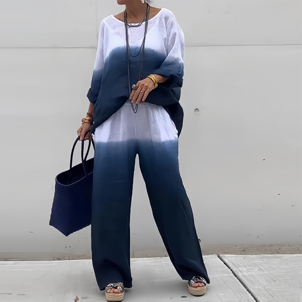 Modisches T-Shirt + Hose aus Baumwolle und Leinen mit Farbverlauf und Rundhalsausschnitt für Damen