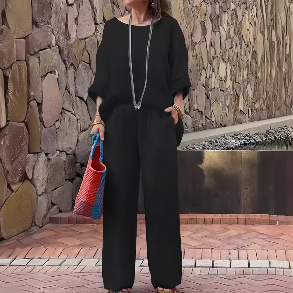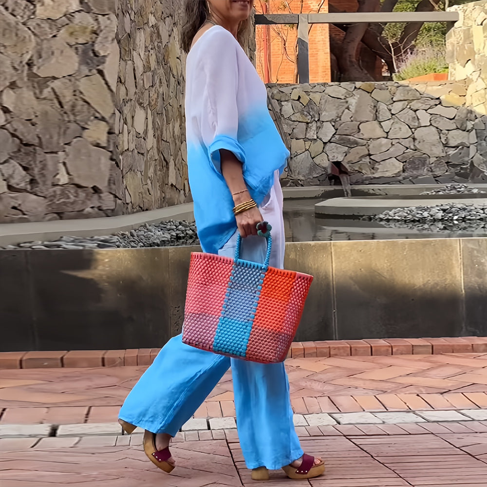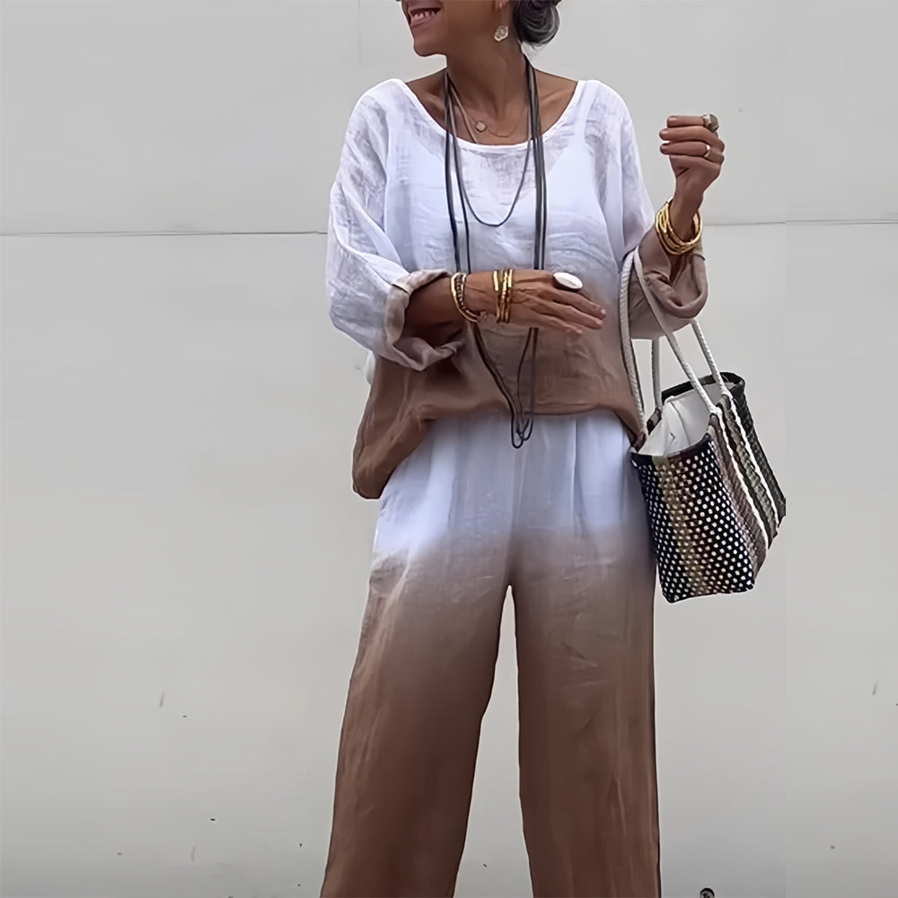 • 1 x Modisches T-Shirt + Hose aus Baumwolle und Leinen mit Farbverlauf und Rundhalsausschnitt für Damen