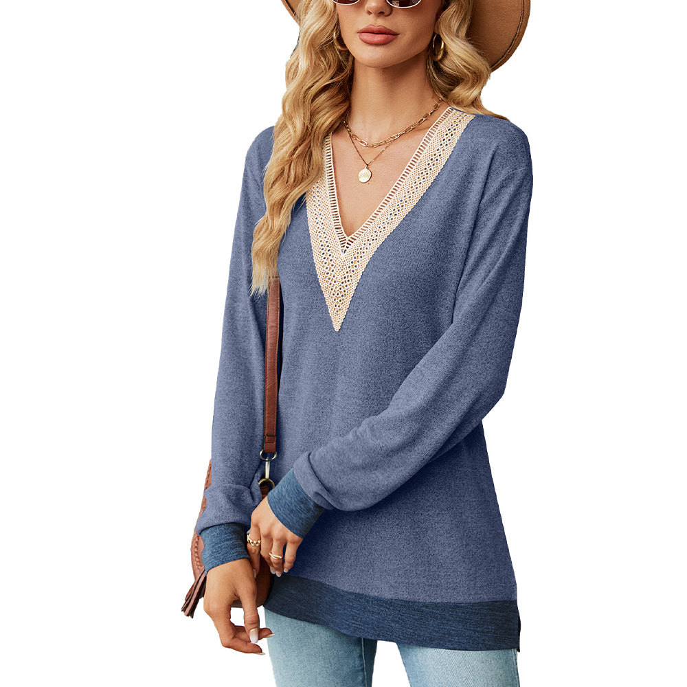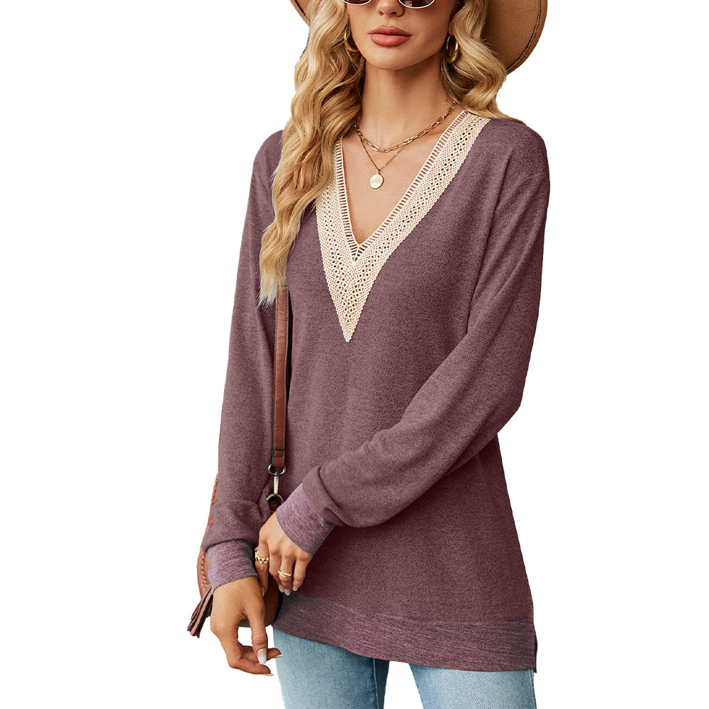 Lockeres Langarm-T-Shirt mit V-Ausschnitt und Schlitz für Damen