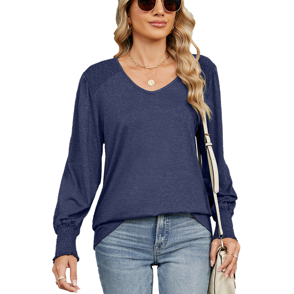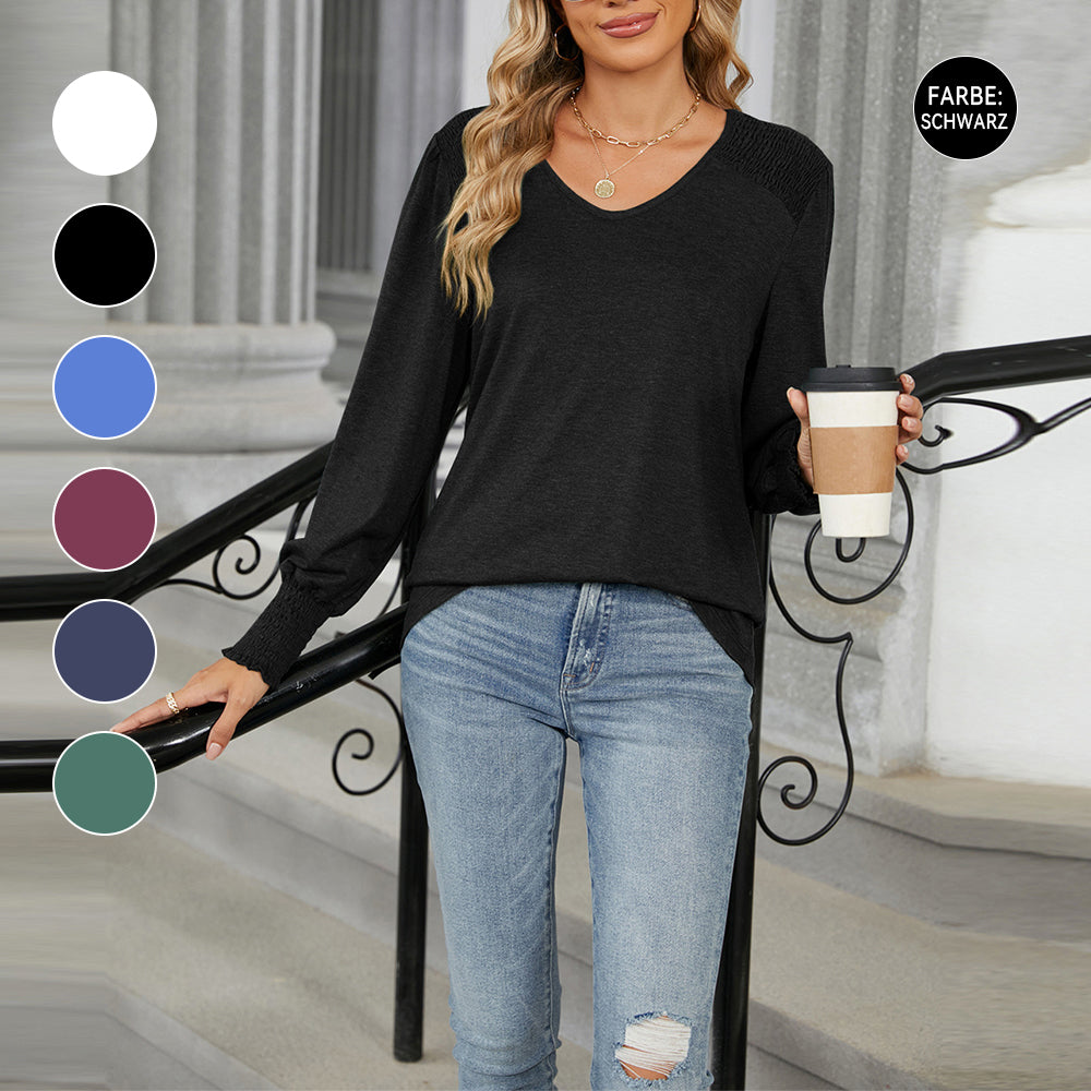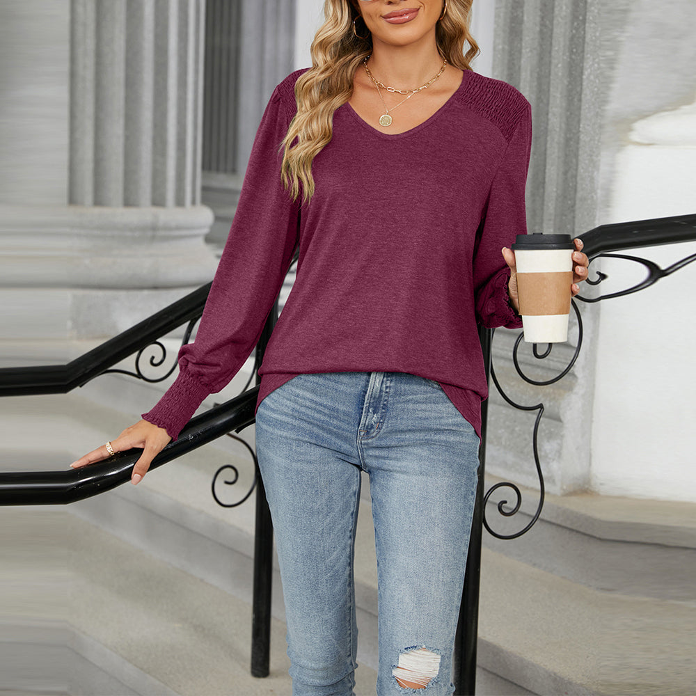 Neues, lockeres Herbst-T-Shirt mit V-Ausschnitt und Laternenärmeln in einheitlicher Farbe und Falten
