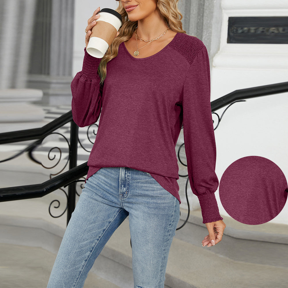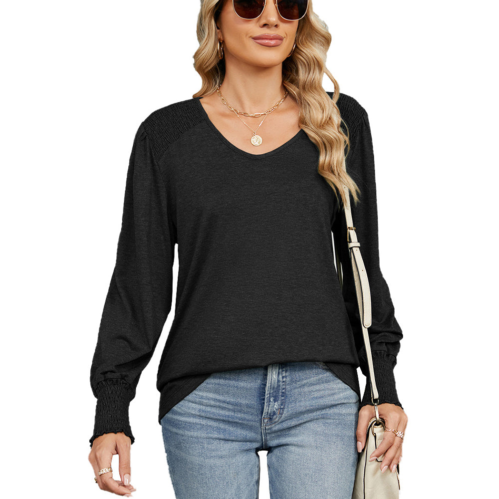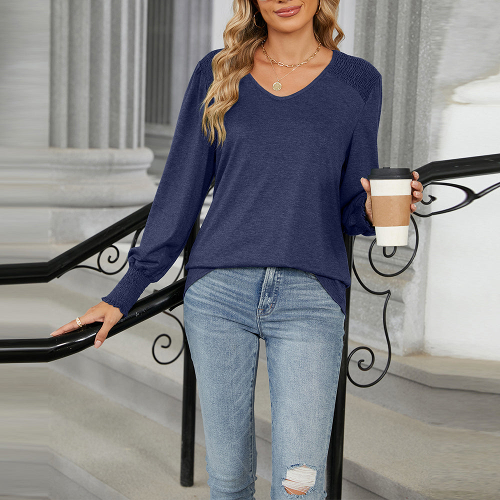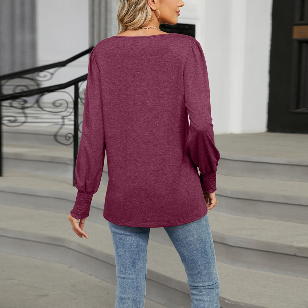 Neues, lockeres Herbst-T-Shirt mit V-Ausschnitt und Laternenärmeln in einheitlicher Farbe und Falten