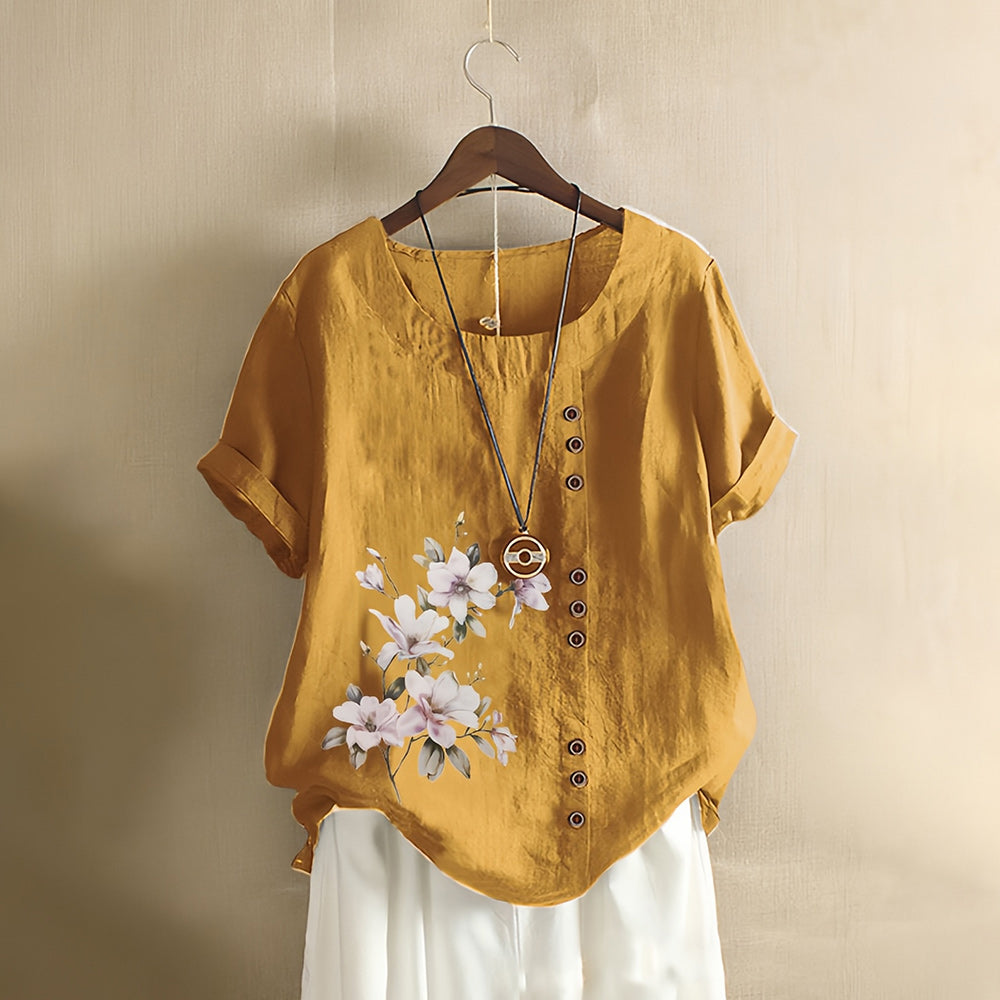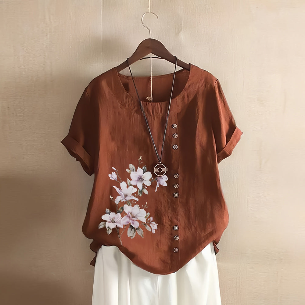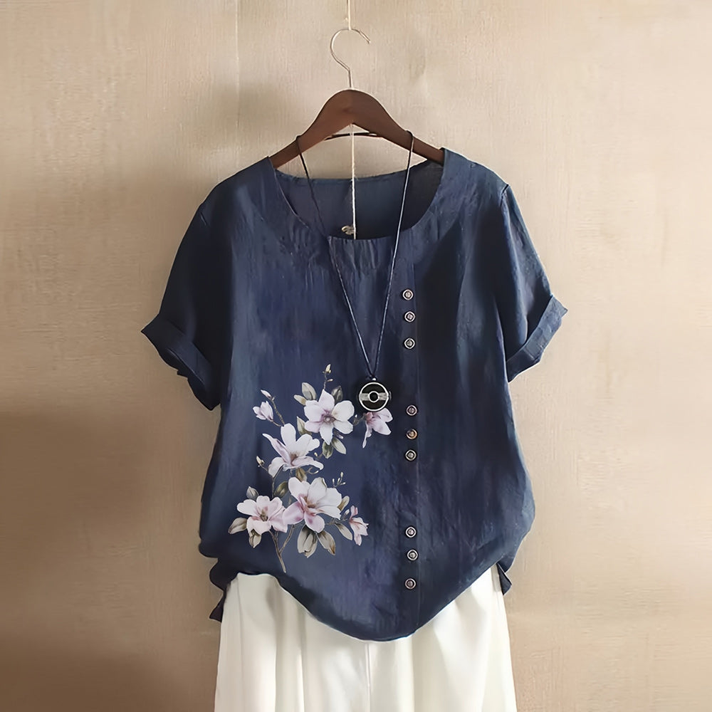 Vintage Damen T-Shirt aus Baumwolle und Leinen mit Blumenmuster