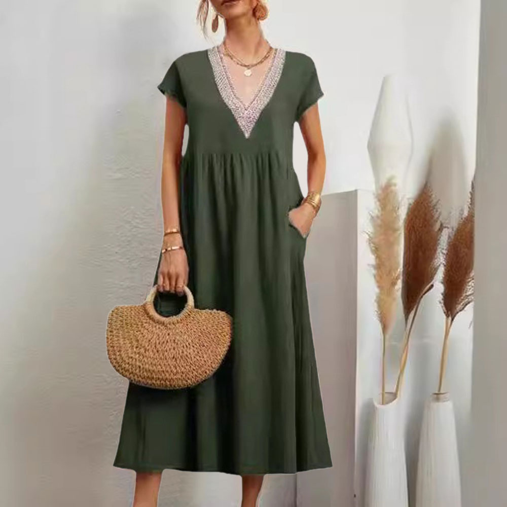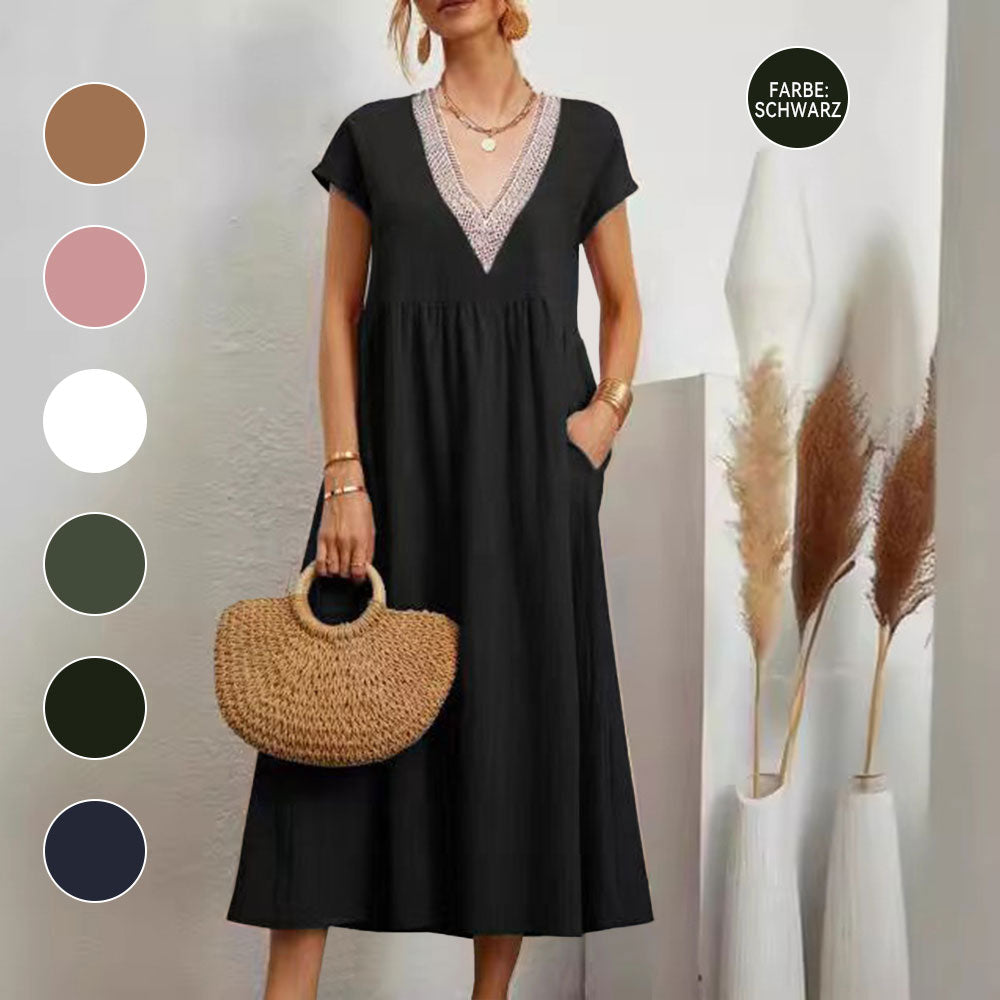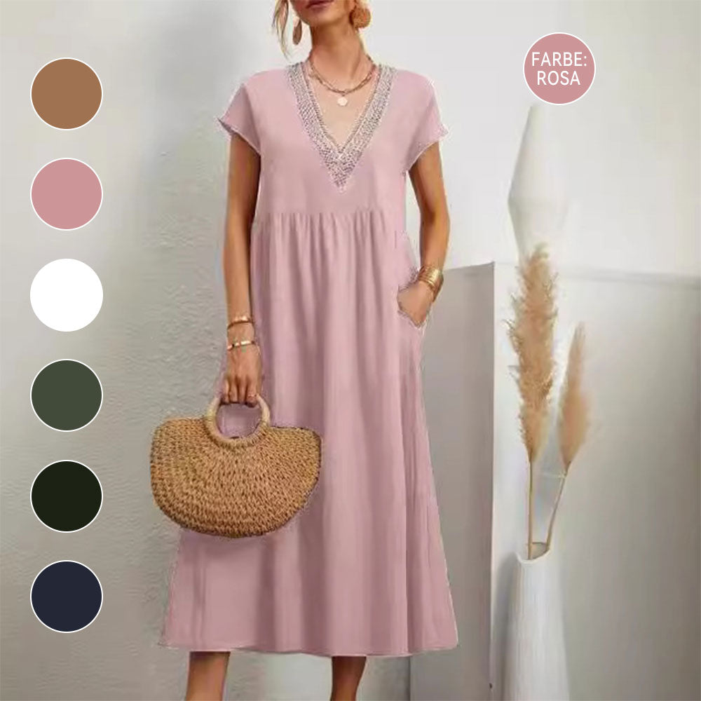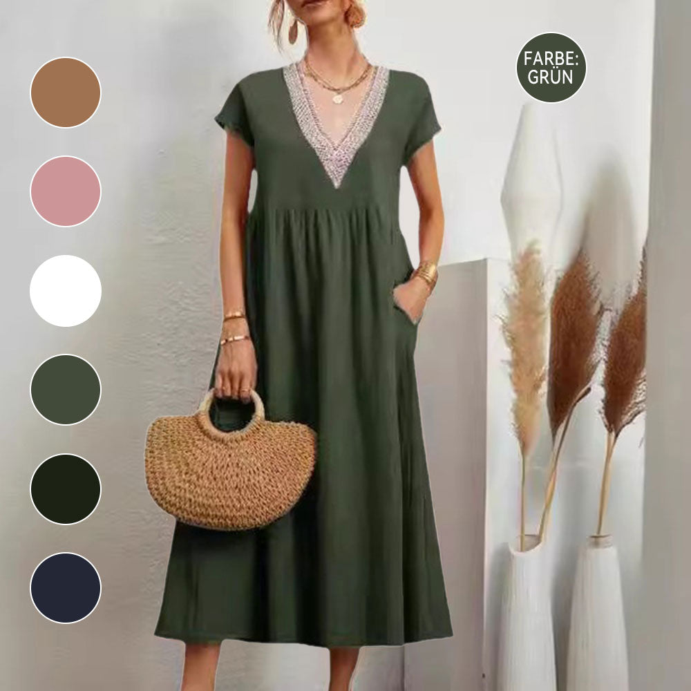 - 1 x Lockeres Kleid mit V-Ausschnitt und Spitzensaum aus Baumwolle und Leinen in Unifarbe