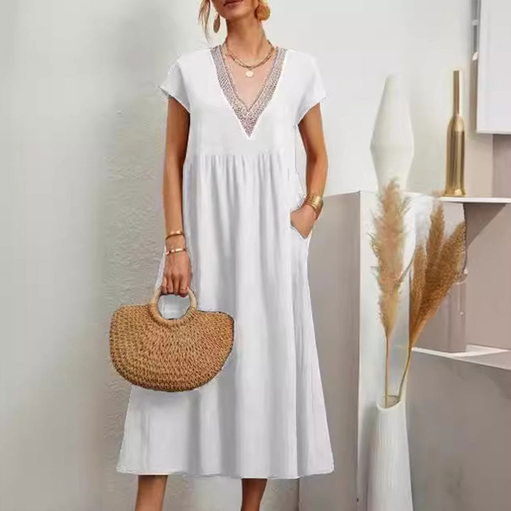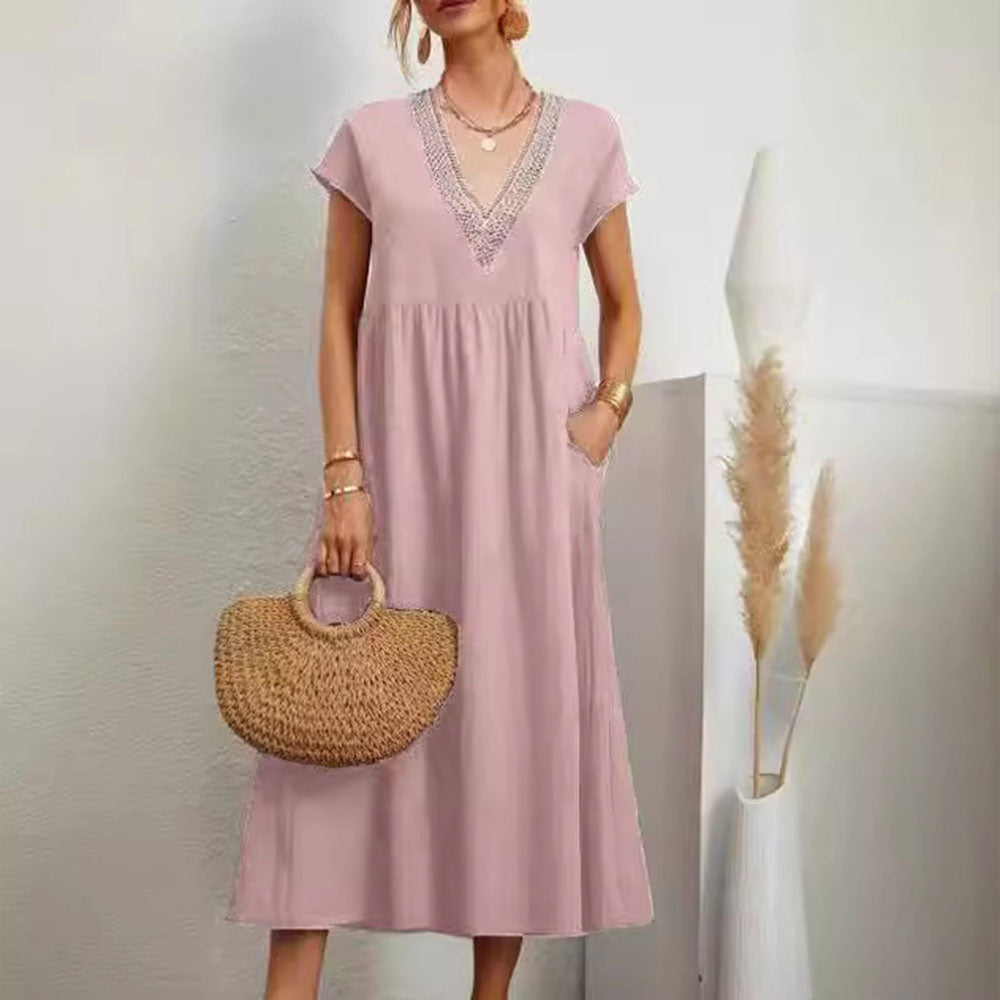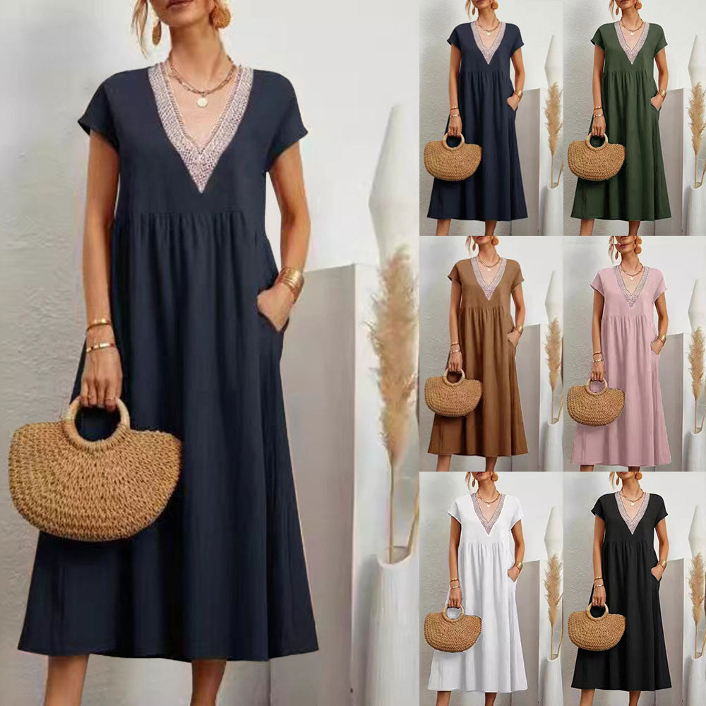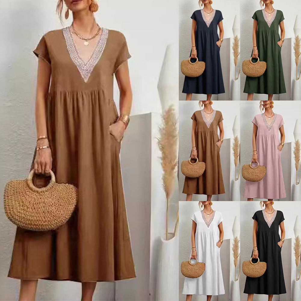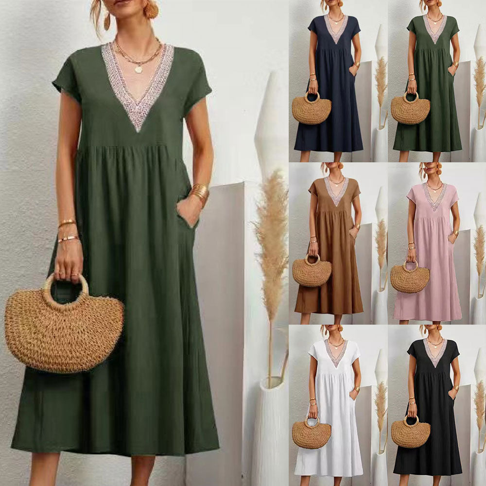 - 1 x Lockeres Kleid mit V-Ausschnitt und Spitzensaum aus Baumwolle und Leinen in Unifarbe