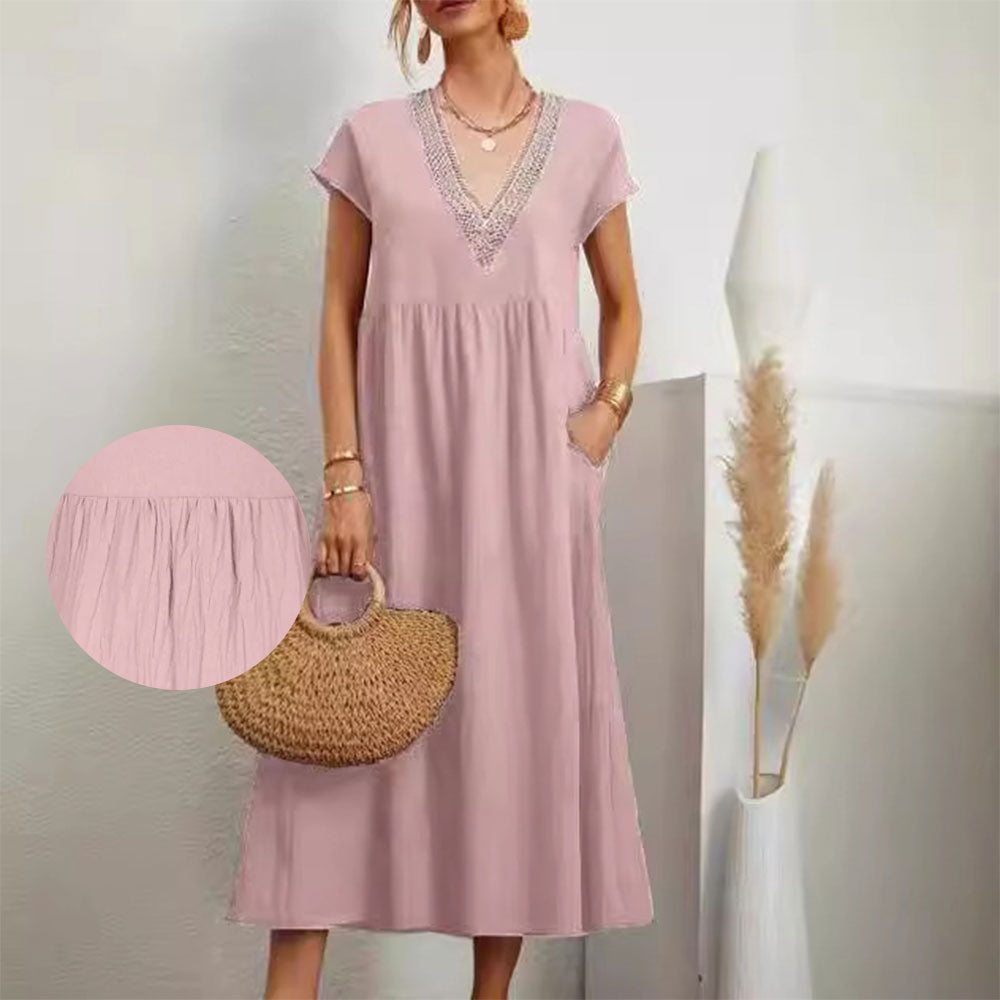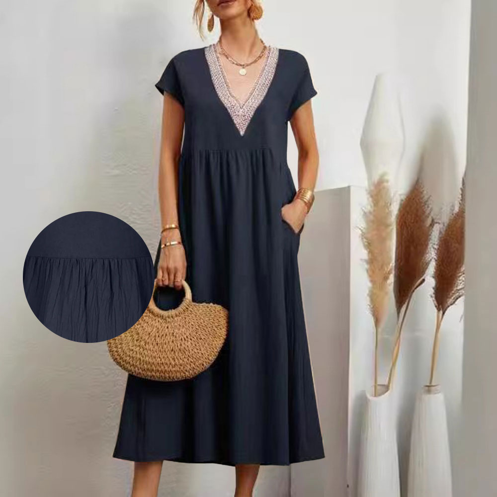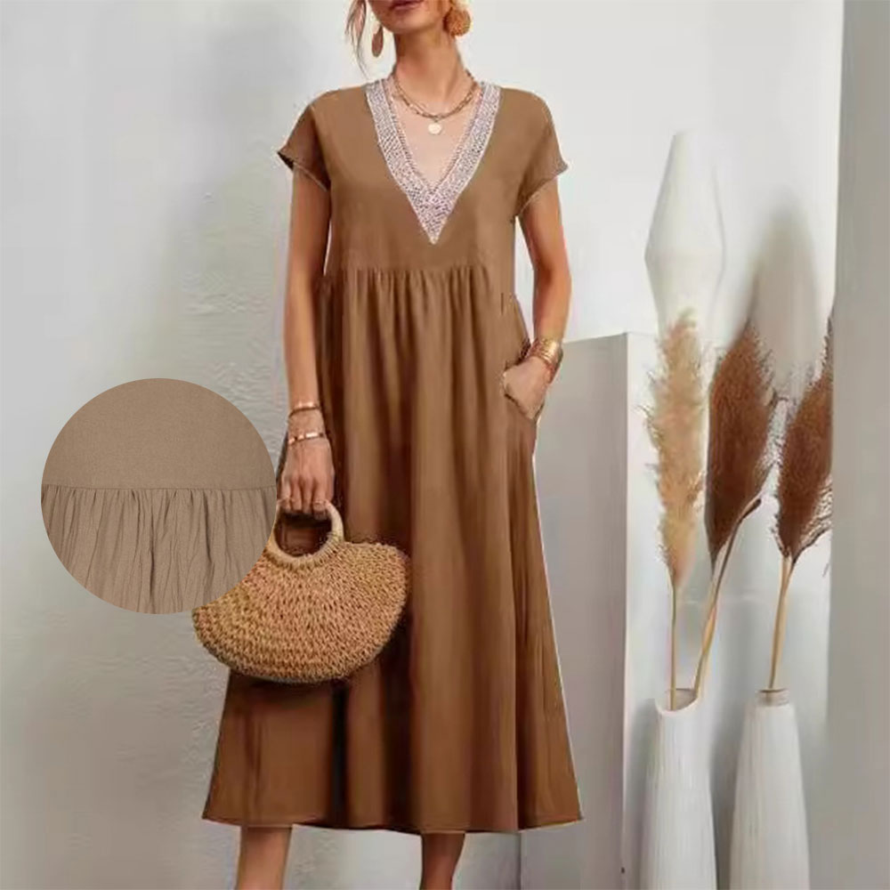 Lockeres Kleid mit V-Ausschnitt und Spitzensaum aus Baumwolle und Leinen in Unifarbe